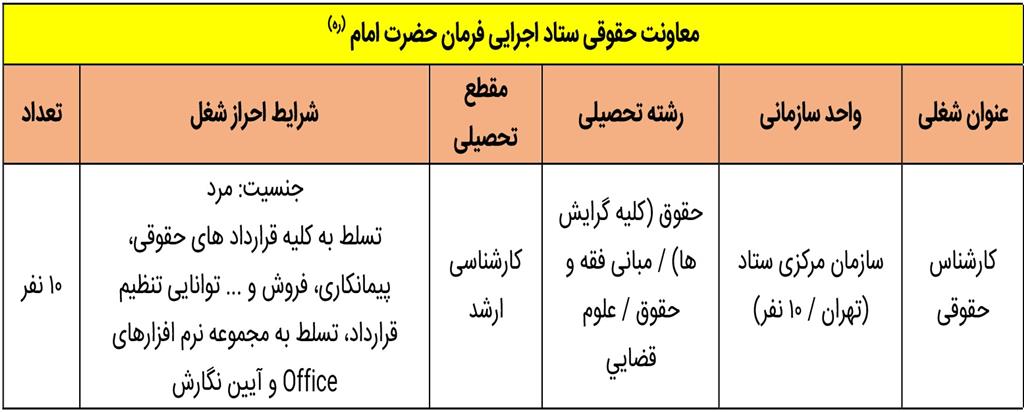 آزمون استخدامی ستاد اجرایی فرمان حضرت امام (ره) به منظور جذب 70 نفر نیروی انسانی مورد نیاز معاونت حقوقی و سازمان اموال و املاک ستاد از بین آقایان واجد شرایط برگزار می گردد.