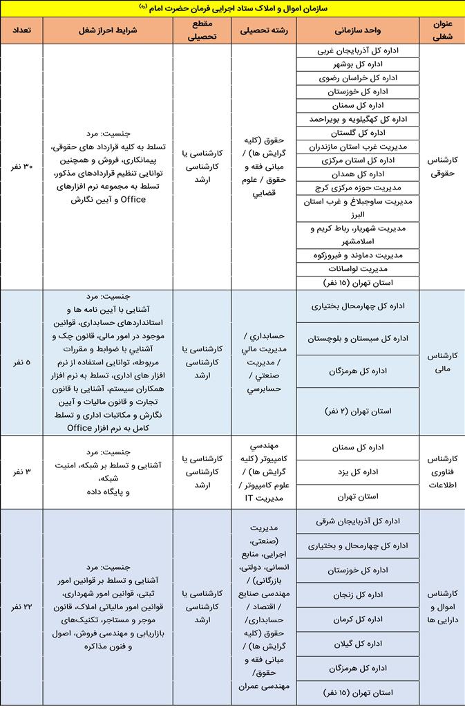 آزمون استخدامی ستاد اجرایی فرمان حضرت امام (ره) به منظور جذب 70 نفر نیروی انسانی مورد نیاز معاونت حقوقی و سازمان اموال و املاک ستاد از بین آقایان واجد شرایط برگزار می گردد.